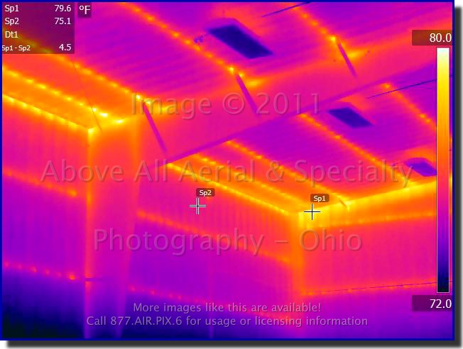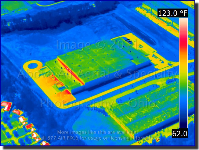 October 3-9, 2011 "Hot Spots" This aerial thermal infrared image shows an area of high temperature where the two different roof elevations meet. This may or may not be a problem. It could be that there is a lack of insulation in this area but it is most likely just a result of the sun's heat being reflected and trapped in the corner. One way to rule out (or confirm!) a problem would be to return to this site before sun rise. Another (slower and more difficult...) way would be to do a site visit and investigate the area more closely. The white spots in the lower left corner of this image are residential roofs - asphalt shingles get very hot during the day. This image has not been adjusted to get temperature readings of those roofs (but it could be...) so they are reading off the scale. To view a larger version of this photo, click on it or click this direct link. |