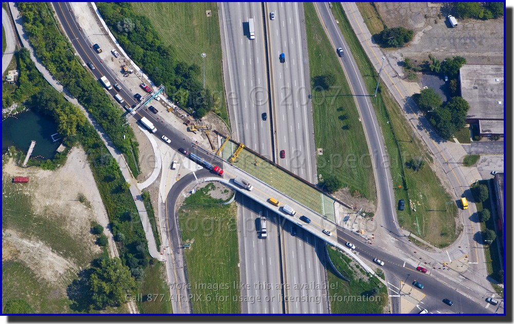 May 16-22, 2011 "Change of Season" Construction season in the northern U.S. is in full swing now that the weather has improved and the days are getting longer. This nearly straight down aerial photo (what we call a "near vertical") shows that two way traffic is maintained on an overpass on Cleveland's east side even though half of the bridge is being completely rebuilt. Drive carefully in construction zones - there are a lot of workers out there doing tough and risky work to keep our roads and highways in good shape. As the signs say here in Ohio, "Give them a brake!" To view a larger version of this photo, click on it or click this direct link. |