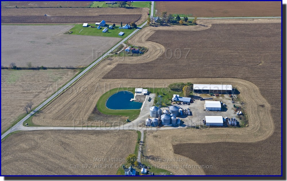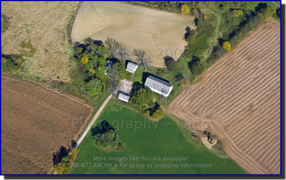 "Harvest Time" Sites such as this dominate Ohio's landscape in October and November. The long hours that farmers put in during the spring and summer finally pay off in the autumn as harvest time arrives. Grain is harvested, collected, dried (as needed), and stored in silos until it is sold. The fall is a very popular time for aerial photographs of family farms and this year was no exception. We photographed several farms for people who were planning ahead for Christmas gifts. If you didn't plan ahead, but think an aerial photo would make a great gift, you'd be right and it's not too late - the trees are mostly bare now, but how about giving a gift certificate? Contact us for details and pricing! To view a larger version of this photo, click on it or click this direct link. |