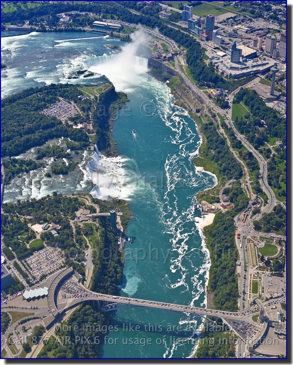 "Romantic River" Niagara Falls is a popular destination for honeymooners and (we're guessing...) people celebrating Valentine's Day. This view of the Falls is looking generally south upriver. Rainbow Bridge, one of the most popular places to cross the border between the United States and Canada (for non-commercial traffic, anyway...) is at the bottom of the photo. The American Falls are in the middle of the photo on the left side of the river and the Horseshoe or Canadian Falls are at the top of the photo. Please check out the Niagara Falls gallery for more photos of the falls. To view a larger version of this photo, click on it or click this direct link. |