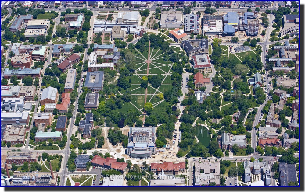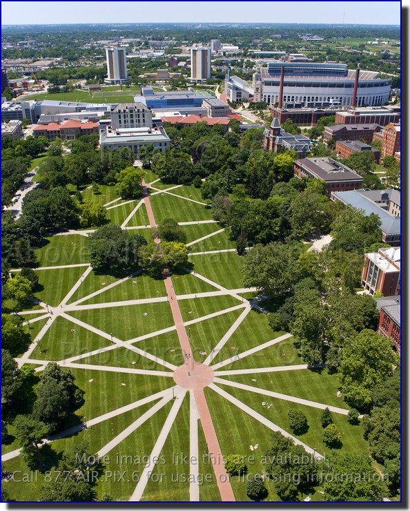 September 12-18, 2011 "Paths of Learning" Summer is over and classes are back in session all across the country. From pre-schools to college campuses, students are once again hitting the books. This aerial view is of The Oval - the center (at least at one time...) of the main campus at The Ohio State University in Columbus, Ohio. Shown here during the relatively slow summer quarter dotted with sunbathers, The Oval has always been a popular place to meet friends, relax between classes, and study in the fresh air. To view a larger version of this photo, click on it or click this direct link. |