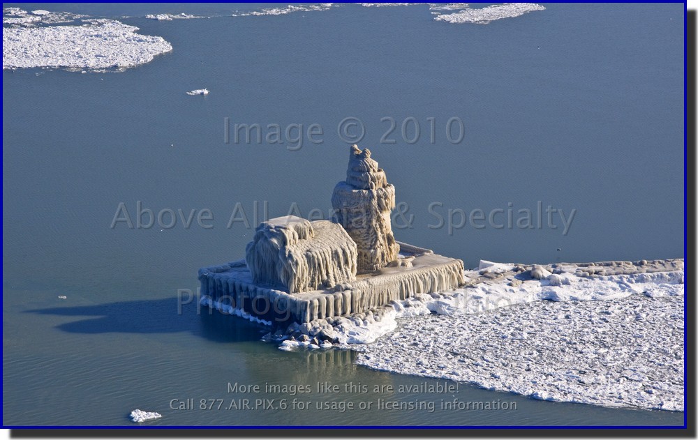 "Cleveland's Ice Lighthouse" High winds and cold temperatures combined in December 2010 to cover this lighthouse in solid ice. The lighthouse sits at the mouth of the Cuyahoga River where it empties into Lake Erie. Ground-based photos of the lighthouse made national news just before Christmas, drawing professional and amateur photographers from all over to capture images. A few days after this aerial photo was taken, unseasonably warm temperatures in Ohio caused all of the ice to melt off of the structure. To view a larger version of this photo, click on it or click this direct link. |