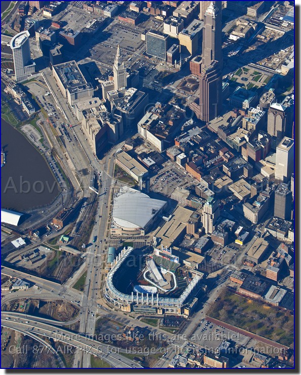 "Snow Days 2011" Several of downtown Cleveland's iconic buildings can be seen in this high altitude aerial. Near the top center of the photo is the Terminal Tower. In lower-middle portion, we can see two of Cleveland's three stadiums - Quicklen Loans Arena (also known as "The Q") and Progressive Field, which is set up for Indians Snow Days at Progressive Field. The second annual Snow Days event features a slightly different layout than last year's event in order to accomodate a regulation hockey rink. On January 15, 2012, Progressive Field will play host to "The Frozen Diamond Faceoff" - an outdoor hockey game between collegiate rivals Ohio State and Michigan. To view a larger version of this photo, click on it or click this direct link. |