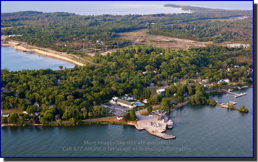 "Island Get Away" Kelleys Island Venture Resort stands out nicely in the lower center of this late day aerial photo. The resort offers 31 luxury suites, a swimming pool, hot tubs, and a beautifully landscaped rock garden and waterfall. Far less busy than South Bass Island and Put-in-Bay to the west, Kelley's Island offers a quiet, more laid back atmosphere for those wishing to get away for a day, a weekend, or a whole summer. To view a larger version of this photo, click on it or click this direct link. |
