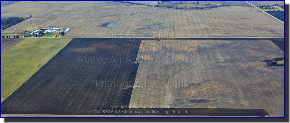 "Preparing the Land" A farmer prepares a field for planting in this panoramic aerial photo taken over rural west-central Ohio. The dark color of the disturbed soil on the left indicates good moisture in soil. Unfortuantely, after this photo was taken, Ohio has been hit with seemingly constant rain - much more moisture than the farmers need! The agricultural season is off to a slow start this year across the Midwest as farmers have just not been able to plant in the now saturated fields. To view a larger version of this photo, click on it or click this direct link. |