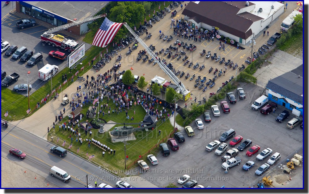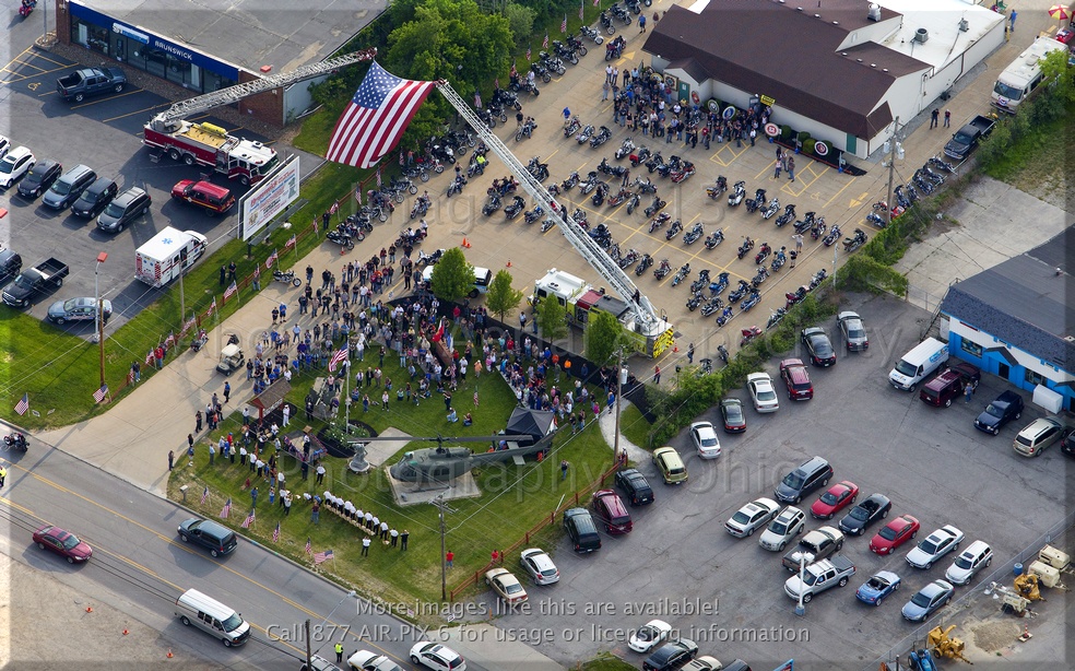 "Thank You, Veterans!" This aerial view of the Ohio Veterans' Memorial Park in Clinton, Ohio, was taken from a helicopter earlier this year. The park has a Vietnam Veterans' Memorial Wall, a POW/MIA Refelction Pond, a Cobra AH-1F helicopter display (which will one day be joined by a Huey medical helicopter), "Gold Star" statues honoring both mothers and fathers who lost children defending our freedoms, and several other monuments. Freedom is not free. Please take a moment to thank a veteran, not only on Veteran's Day, but every day... To view a larger version of this photo, click on it or click this direct link. |