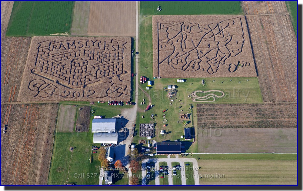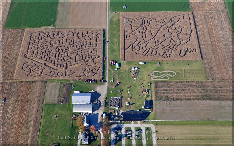 September 30 - October 6, 2013 "Fall Fun" It's that time of year again - the time when our thoughts turn to pumpkins, apple cider, colorful leaves, and corn mazes! This aerial photo is of the two corn mazes at Ramseyer Farms, located between Cleveland and Columbus, Ohio, near Wooster. (Note: None of the aerial photos on their web site were taken by us.) This photo was taken last fall - the maze on the left (called the "Mystery Maze") changes each year while the Ohio maze on the right remains the same. The farm has become an annual must-go destination for families all over Ohio. One low priced admission gets you access to both corn mazes (plus a mini-maze that the youngest guests will enjoy), a hayride, and numerous other fall-themed play areas and activities appropriate for all ages. To view a larger version of this photo, click on it or click this direct link. |