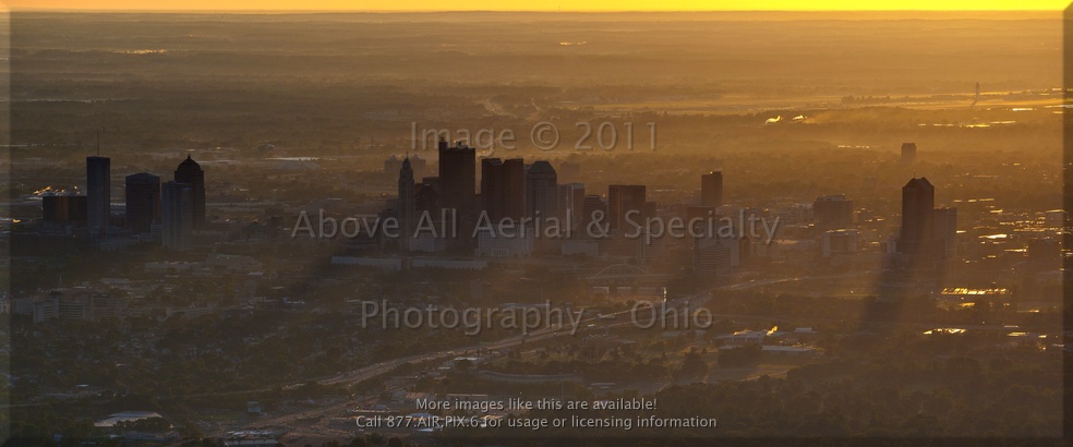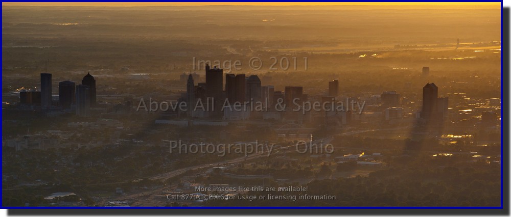 "Dawn" This panormaic view of downtown Columbus (Ohio) at sunrise was taken from the southwest side of the city, looking northeast. The yellow-orange sky takes the term "golden hour" to its most literal meaning and the long building shadows that can be seen in the thin morning mist add a nice dramatic effect to this photo. Since most of our clients are interested in the details they can see in the photos, we tend to do most of our flying during the middle of the day when the shadows are minimized. However, when the client wants images for marketing purposes, we can shoot at dawn, dusk, night, or anytime when the light will work best for their purposes. We thought a dawn photo was appropriate for the first "Stock Photo of the Week" image for the new year. We look forward to another year of helping our clients in a wide variety of ways, however - and whenever - we can! To view a larger version of this photo, click on it or click this direct link. |