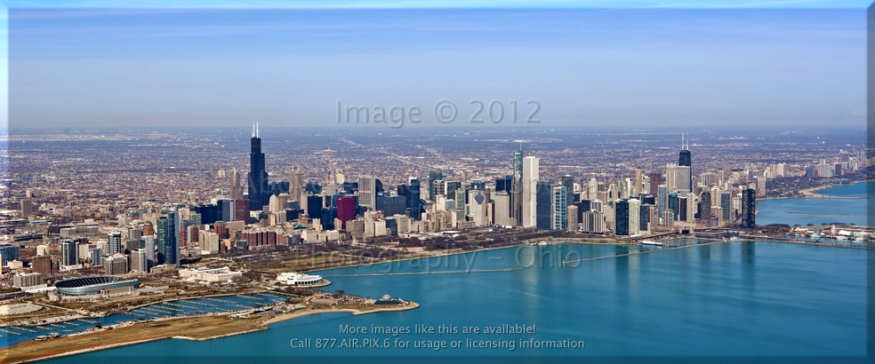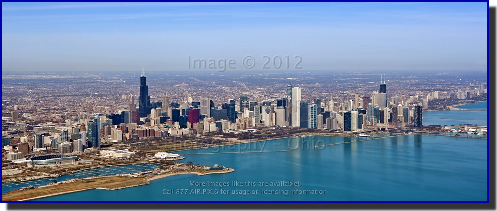 May 6-12, 2013 "Downtown Chicago, Illinois" Continuing west from last week's featured city of Toledo, we go across the southern border of Michigan / northern border of Indiana, swing around the south shore of Lake Michigan, and come upon this amazing skyline. This aerial panoramic view of Chicago, Illinois, was taken in early spring on a beautifully clear day with nearly unlimited visibility. The long, skinny light-colored area near the horizon on the left edge of the photo is Chicago's O'Hare airport which is about 16 miles from downtown. Closer to and south of downtown, near the left edge of the photo, Soldier Field (home of the Chicago bears football team) is visible. Following the very blue waters of Lake Michigan north about 2 miles, part of Chicago's famous Navy Pier can be seen at the right edge of the photo. To view a larger version of this photo, click on it or click this direct link. |