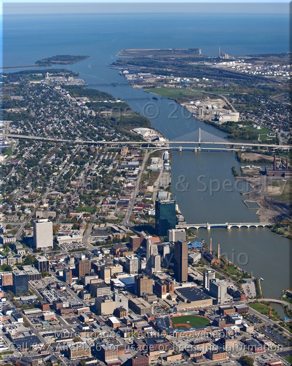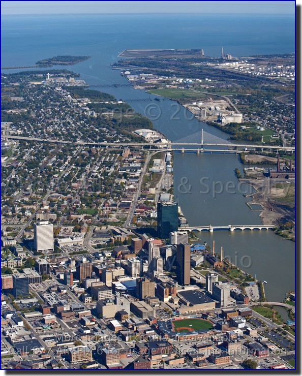 April 29 - May 5, 2013 "Downtown Toledo, Ohio" Last week, we featured a view of Youngstown, Ohio, in northeastern Ohio. This week, we head a little bit north and then west to follow the shoreline of Lake Erie all the way to Toledo in the northwestern corner of the state. In this portrait-oriented aerial view of Toledo, we can see the Maumee River passing downtown, heading north to Lake Erie. On its way, it passes under the recently re-constructed Cherry Street drawbridge and the distinctive Veterans' Glass City Skyway suspension bridge which carries Interstate 280 across the river. The tall, dark building on the west end (left side) of the Cherry Street bridge is known as "Fifth Third Center at One SeaGate." It is the tallest building in Toledo. The building was previously featured as a "Stock Photo of the Week" back in 2011. On the south side of downtown, it is easy to pick out Fifth Third Field, home of the Toledo Mud Hens minor league baseball team. To view a larger version of this photo, click on it or click this direct link. |