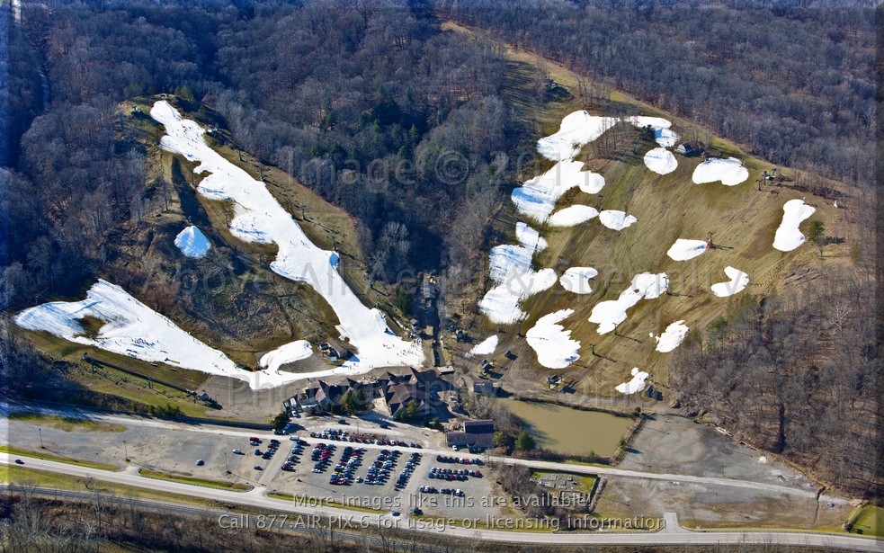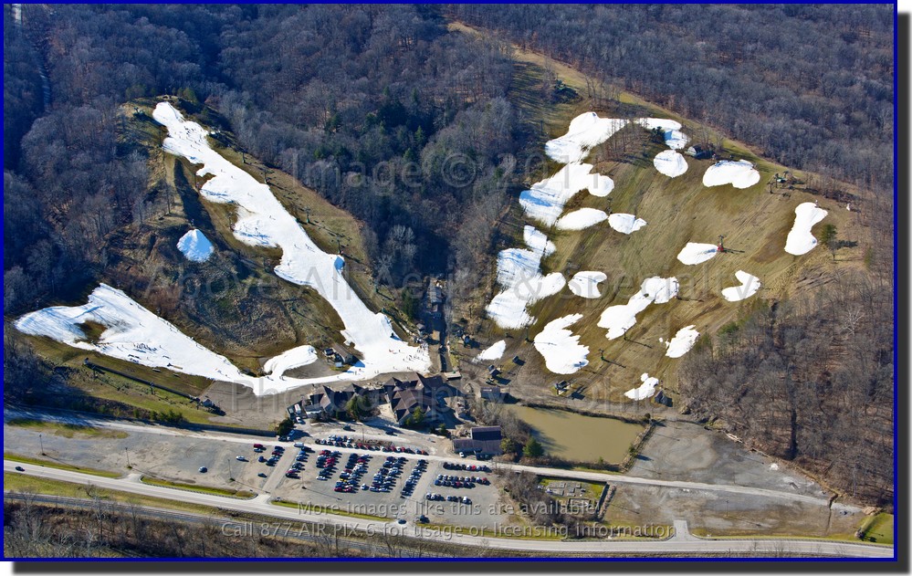 January 21-27, 2013 "Bare Slopes" Last winter's unusally mild weather was nice for most northern Ohioans, but not for those who enjoy snow skiing and certainly not for the owners and operators of ski resorts such as this one - Boston Mills Ski Resort in Peninsula, Ohio, just outside of Cleveland. The snow makers clearly could not compete with Mother Nature on these slopes. It appears that the resort gave up trying to cover the northern runs (seen on the right side of this photo). The southern runs on the left are angled in such a way that they receive less direct sunlight and were therefore more easily covered. So far this year, northern Ohio is experiencing a more typical winter with lower temperatures and more snow; we can't say that we're really thrilled about that, but it is good news for skiers and businesses that rely on them! To view a larger version of this photo, click on it or click this direct link. |