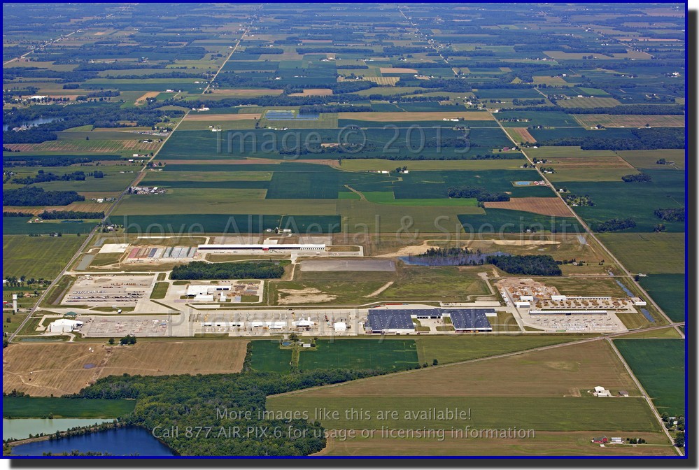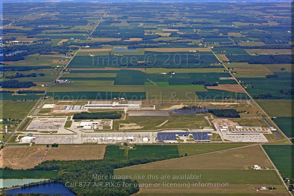 August 12-18, 2013 "Holiday City Expansion" Holiday City is a small town in the extreme northwestern corner of Ohio. It is located off of Exit 13 of the Ohio Turnpike, just 13 miles east of the Indiana border and less than 7 miles south of the Michigan border. As can be seen in this wide angle aerial view, most of the land in this rural tri-state region is flat farmland. However, a large parcel of that land is currently under development northeast of town. With room for expansion and nearby access to both the turnpike (which is not visible in this photo, but is located just below the bottom edge) and a major railroad route (which is visible as a diagonal line coming from the lower left corner), this project is well suited for the warehouses and distribution centers that are currently under construction. To view a larger version of this photo, click on it or click this direct link. |