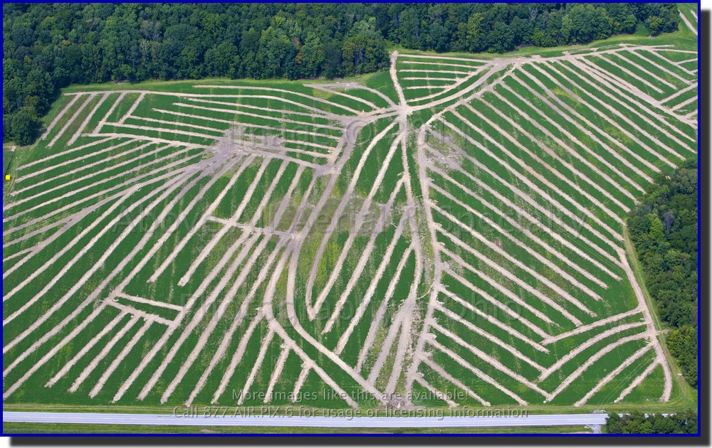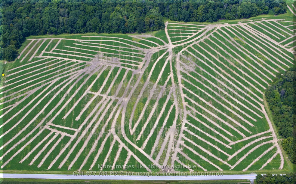 August 19-25, 2013 "Strange Farmland Patterns" The unusual, almost "herringbone" pattern seen in this field is not the result of an artist with a grand vision, a crazy urban planner, or even aliens from outer space. These lines show where underground drainage tile has recently been placed. Ohio farmers routinely dig trenches and bury perforated plastic tile several feet underground to help excess water drain from their fields. The numerous long, nearly parallel lines usually lead back to a larger mainline which allows the water to flow out of the field and into a man-made ditch, retention pond, or natural waterway. If the farmers did not do this, water from heavy rains would just sit on top of flat, saturated fields and drown the crops before it had a chance to soak in naturally. To view a larger version of this photo, click on it or click this direct link. |