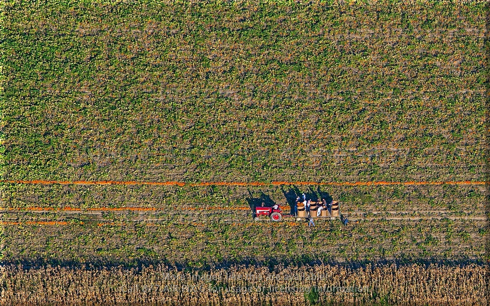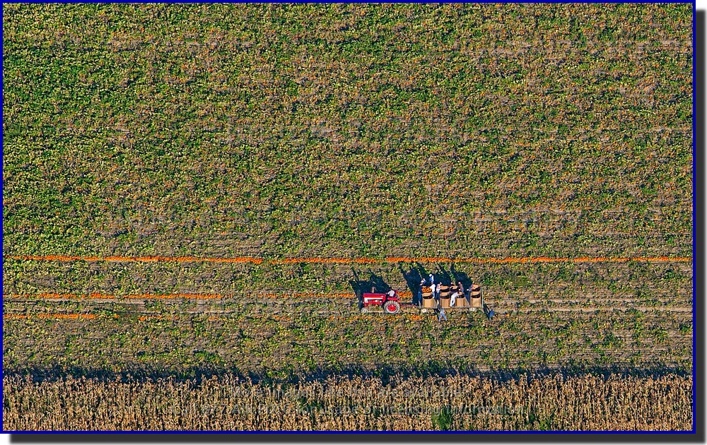 October 7-13, 2013 "Speaking of Pumpkins..." Here we see some farm hands picking up long rows of pumpkins from high above. Unlike the typical "u-pick" pumpkin patches that most of us have wandered around in search of the perfect pumpkin, when farms like this one near Fremont, Ohio, sell tons of pumpkins to large customers, the harvest needs to be a little more organized for maximum efficiency. First, workers walk down the rows and cut the pumpkins from the vine. Next, they roll the good ones to the edge of strategically placed drive lanes in the field. Finally, tractors pulling trailers of large bins drive along the row and the workers pick up the pumpkins. Pumpkins that are not fit for sale are left in the field - they will be broken up and allowed to compost. This environmentally-friendly process allows imperfect pumpkins to serve as fertilizer for future crops. To view a larger version of this photo, click on it or click this direct link. |