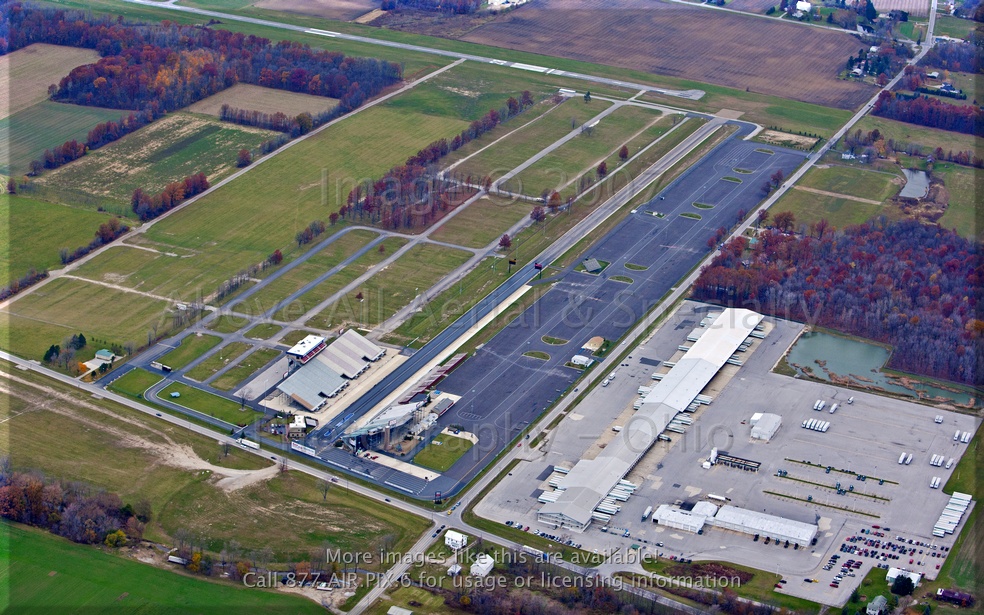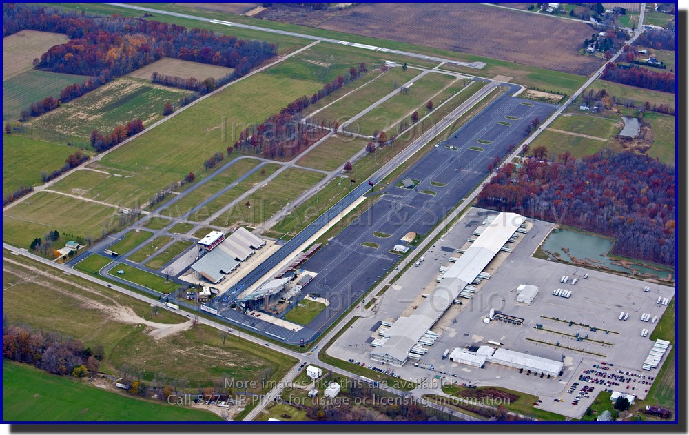 June 17-23, 2013 "Celebrating 50 Years" All is quiet at the Summit Motorsports Park near Norwalk, Ohio, in this late fall aerial view. However, during the summer, the dragstrip is busy with exciting racing events. The track is currently celebrating its 50th year in operation in Norwalk. Coming soon are the Summit Racing NHRA Nationals which will take place July 4th through the 7th. The on-track "fireworks" at this event are sure to be spectacular, but if that's not enough for you and your family, the track will put on an actual fireworks show on Friday night, July 5th. The Norwalk / Huron County airport is visible just to the north of the dragway. Pilots are cautioned on aeronautical charts not to mistake the drag strip for a runway. To view a larger version of this photo, click on it or click this direct link. |