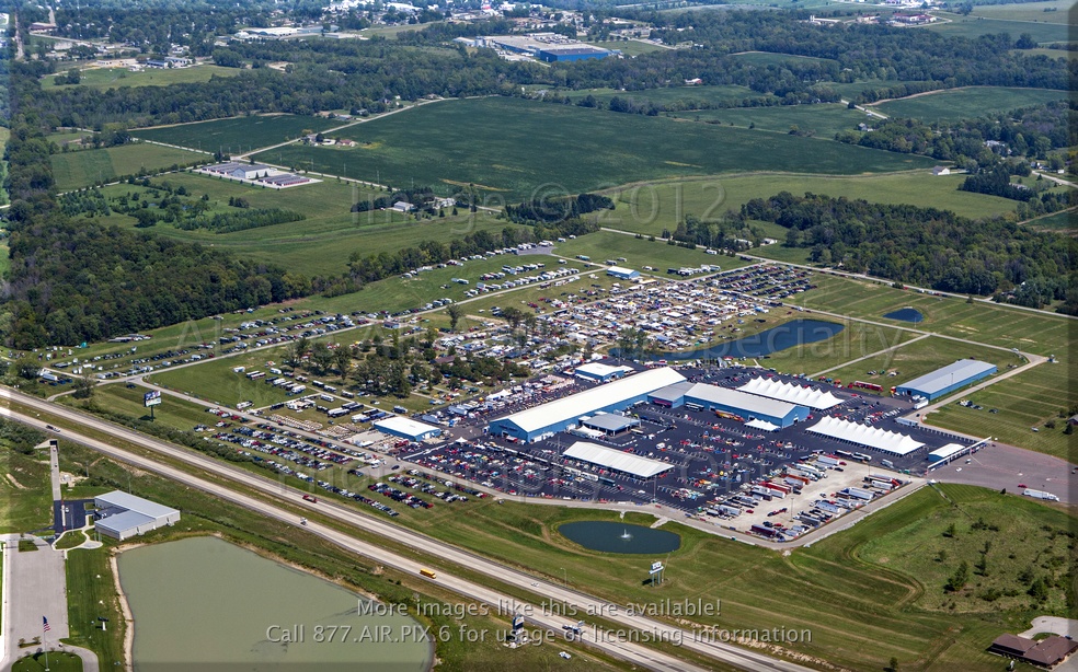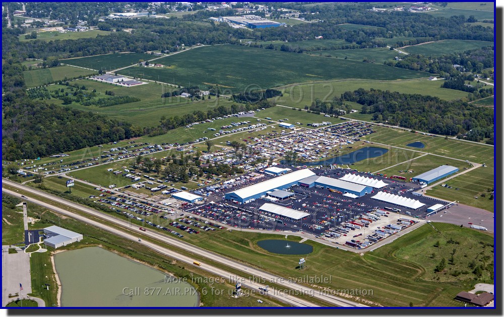 September 23-29, 2013 "Huge Auction" Each Labor Day weekend, car enthusiasts gather at the Auburn (Indiana) Auction Park to bid on cars and parts and anything else automotive- related. Billed as "the largest purpose-built, dedicated automotive auction facility in the world," the park covers 235 acres. This wide angle oblique aerial view of the park was taken during the 2012 event. More information on the park and the event can be found on the Auctions America web site. (Note: You may see another aerial photo of the facility on their web site. It is not ours...) To view a larger version of this photo, click on it or click this direct link. |