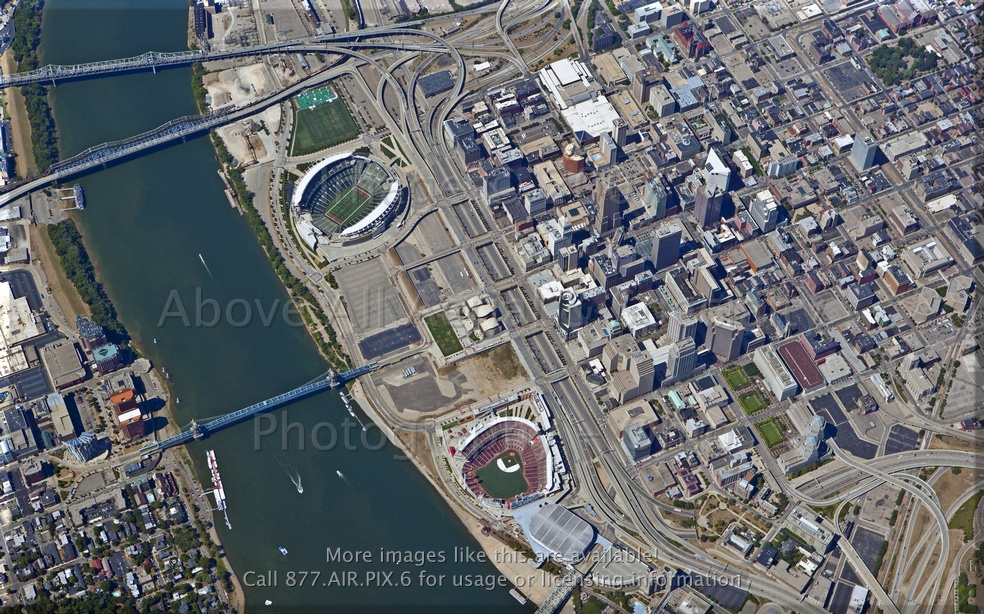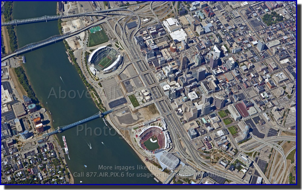 April 15-21, 2013 "Downtown Cincinnati, Ohio" We don't get to downtown Cincinnati, Ohio, very often, but we do get there. (Cincinnati is actually closer to our Indianapolis office than it is to our Ohio office, and they serve that area more frequently). This view was taken from a very high altitude - about 10,000 feet (nearly 2 miles!) above the city. Still, thanks in no small part to our professional Canon cameras and lenses, one can still clearly read the word "Bengals" in both end zones at Paul Brown Stadium in the full size version of this photo. Also clearly visible next to the Ohio River, are the red seats of Great American Ballpark, home of the Cincinnati Reds baseball team. To view a larger version of this photo, click on it or click this direct link. |