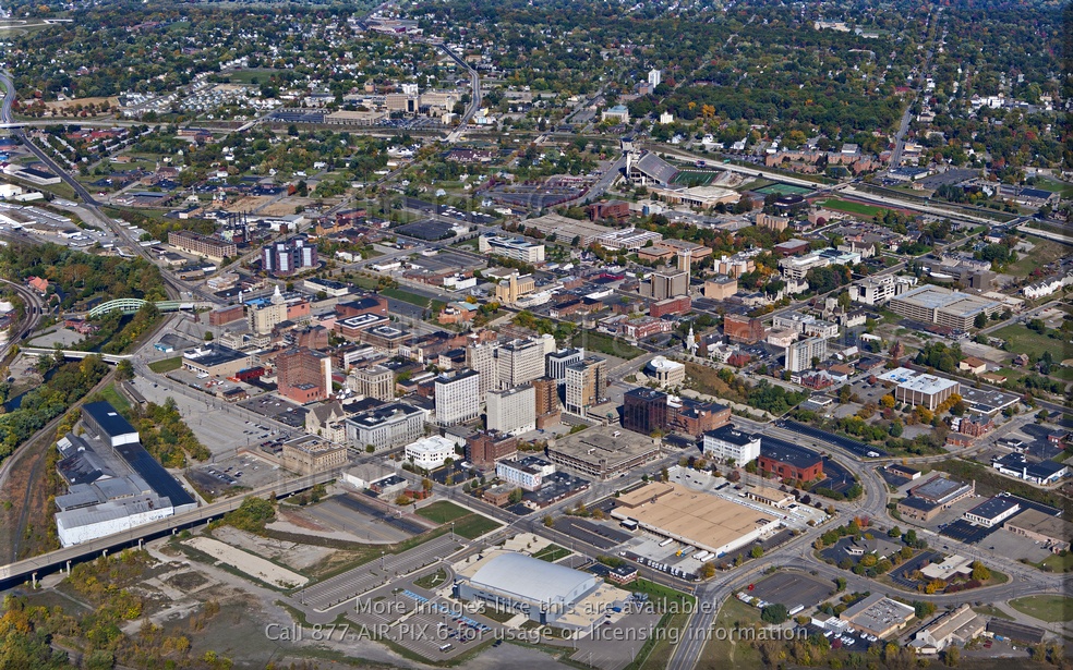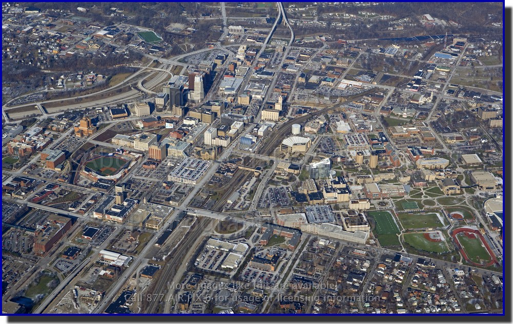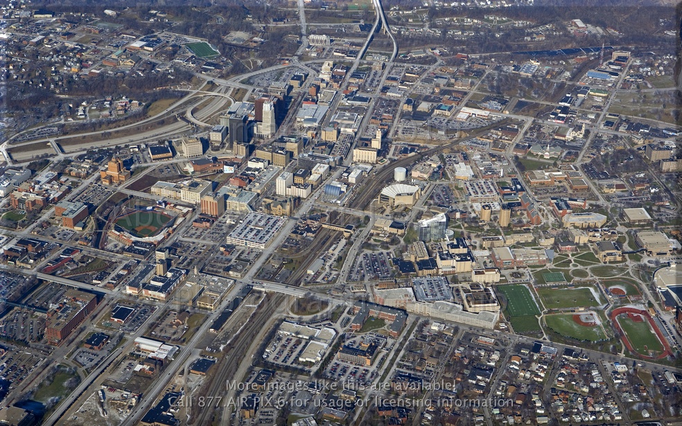April 1-7, 2013 "Downtown Akron, Ohio" It seems like we have lots of photos of Cleveland and Columbus in our gallery, so for the next few weeks, we'll feature some other "downtowns" of areas that we serve. First up is downtown Akron, Ohio. This wide-angle, high oblique aerial photo was taken on a sunny January day. The low winter sun creates shadows that look more like late day shadows, except that high-noon winter shadows point north. These can be seen in the upper left part of the image. In the middle of the photo is the Quaker Square area and to the right, the frozen campus and sports fields of the University of Akron are visible. To view a larger version of this photo, click on it or click this direct link. |