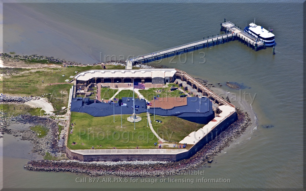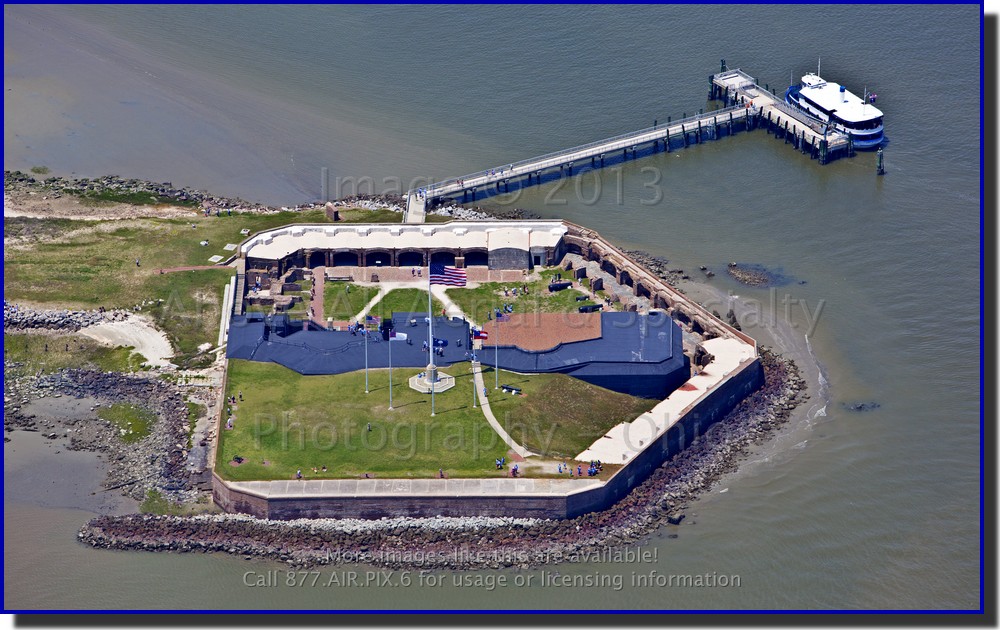 June 24-30, 2013 "Where the Civil War Began" Fort Sumter National Monument is located in Charleston Harbor, South Carolina. On April 12, 1861, Confederate forces opened fire on this fort and the Civil War began. Artillary guns bombarded the Federal fort for 34 straight hours until the fort was surrendered and evacuated. The fort is accessible only by boat. If you are lucky enough to have your own boat in the area, you can visit the fort free of charge during normal hours. Otherwise, you must purchase tickets for the ferry seen in this photo. The ferry is run by a private company, under authorization of the National Park Service. Regarding the array of flags seen in this aerial view of the island, the National Park Service web page about Fort Sumter says: "Besides the 50-star United States flag, five replicas of historic flags regularly fly over Fort Sumter. These represent a timeline of Civil War flags at the fort from 1861-1865." To view a larger version of this photo, click on it or click this direct link. |