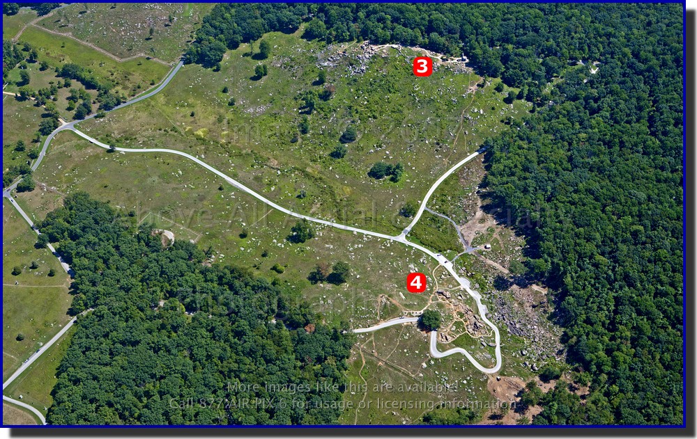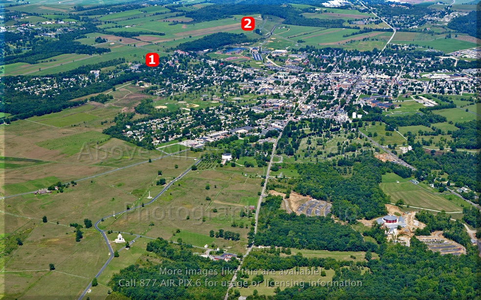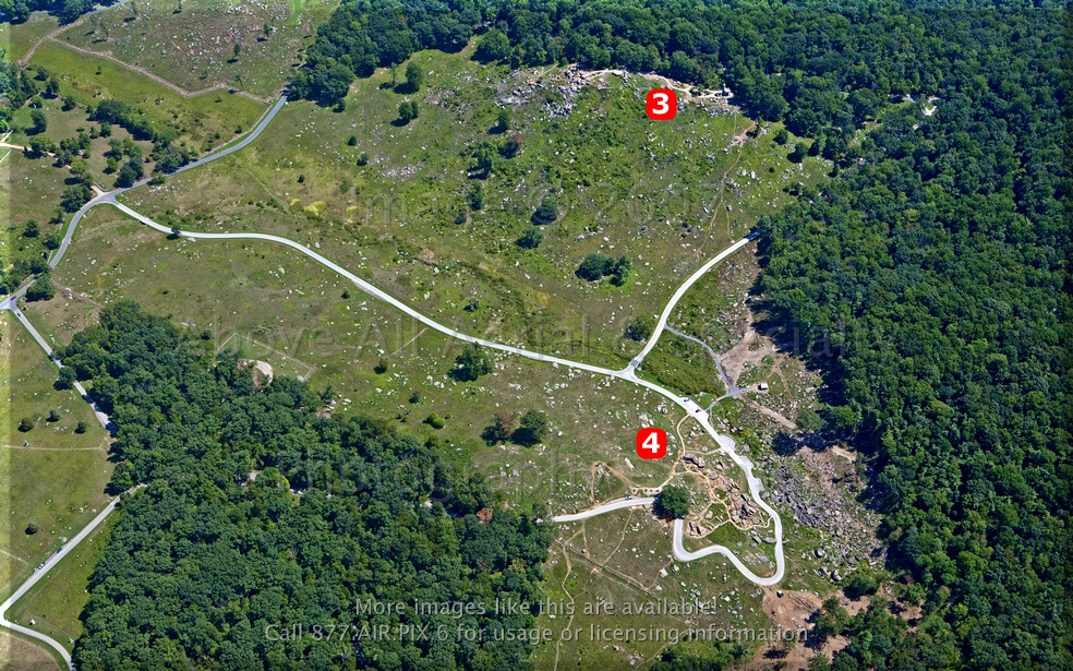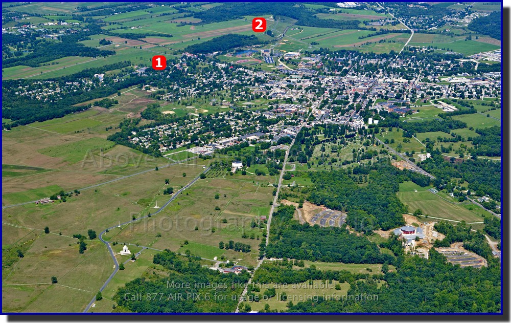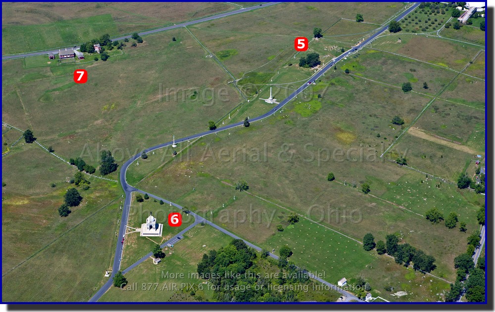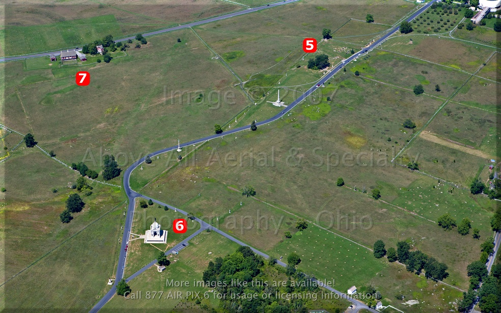 "The Battle of Gettysburg" July 1 marks the 150th anniversary of the start of the Battle of Gettysburg, which is widely held as the turning point of the Civil War. Out of respect and honor for those that fought and died there, here are some photos we took of the battlefield back in 2007... The first view shows where the battle started - to the west of the town of Gettysburg where Confederate troops advanced on McPherson Ridge (1) about 8:00 AM on July 1, 1863. The Union army held the line from here to Oak Ridge (2) most of the day, before falling back to the east side of town around 3:30 in the afternoon. On July 2, 1863, the battle had spread to the south side of town. Confederate troops were advancing on Little Round Top (3) which was lightly defended until General Meade was alerted by his chief engineer of the threat. The rocky area below (southwest of...) Little Round Top is known as Devil's Den (4). On July 3, 1863, in what is known as the "High Water Mark" of the battle, about 7,000 Union troops stationed around the "Copse of Trees" (5) held off Pickett's Charge - a 12,000-troop strong offensive assault against the Federal center. This was the climax of the battle and the Union army held strong. Lee's army began retreating on July 4, 1863. The other items of interest labeled in the third photo are The Pennsylvania Memorial (6) and Codori Farm (7) which was the center of Pickett's Charge and is a landmark that identifies the central point of the battlefield. A wide angle aerial view of the entire battlefield can be seen in our 2007 Stock Photo of the Week Gallery. The National Park Service's offical map of the battlefield can be downloaded here or from our site. To view a larger version of any photo, click on it or use these direct links: Photo 1 | Photo 2 | Photo 3 |