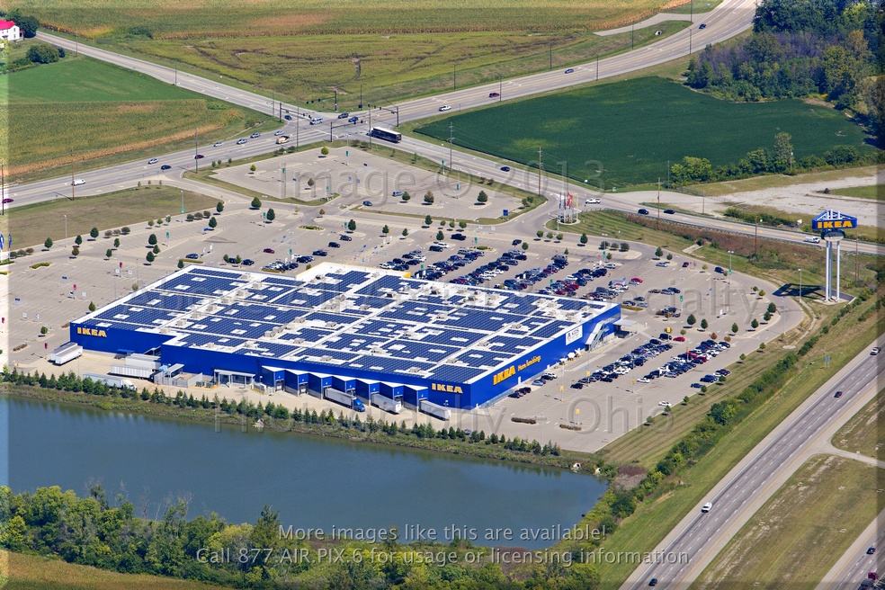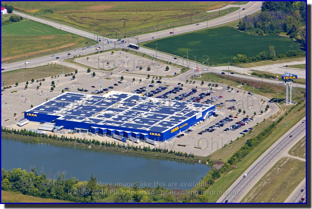 November 18-24, 2013 "Greenish Blue" The IKEA Group of companies, owned by a foundation in the Netherlands, promotes sustainability, philanthropy, and affordability in their corporate culture. One example of their "Planet Positive" strategy is their investment in solar power for their marquee blue retail stores. IKEA currently has 49 retail stores in North America. As can be seen in this shallow angle oblique aerial photo of their store near Cincinnati, Ohio, virtually every possible square foot of the roof is covered by solar panels to help with their goal of "going green" and becoming less dependant on fossil fuel energy. To view a larger version of this photo, click on it or click this direct link. |