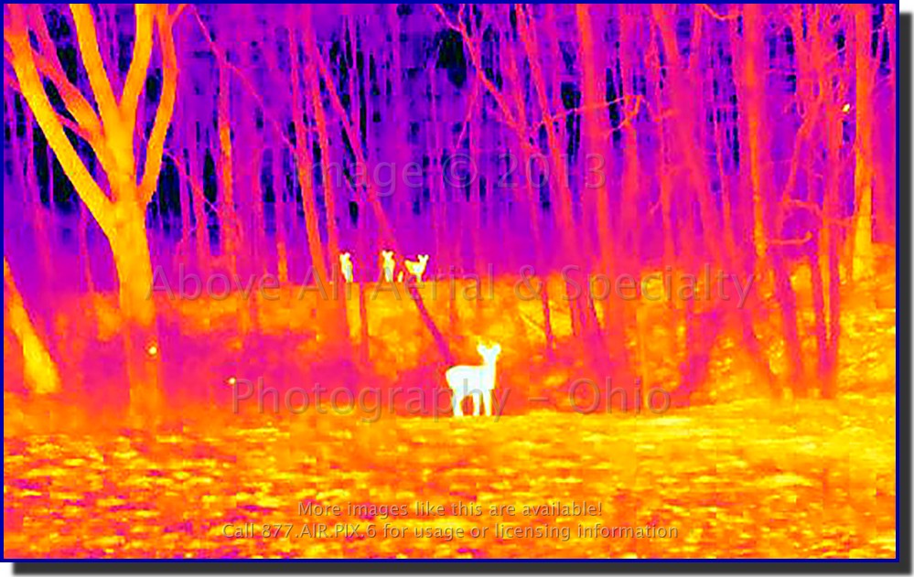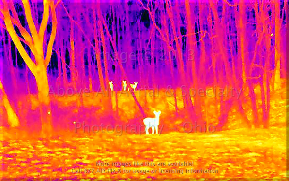 November 4-10, 2013 "Can You See the Whole Picture?" The leaves are quickly falling from the trees here in the northern part of the United States. Soon, winter will arrive and it will be the perfect time to do deer (or other wildlife) surveys. When the leaves and tall grasses disappear for the winter, so do the hiding places for many animals, including deer. Many land owners, municipalities, counties, private developers, and others want to know how many deer are on their property or within their boundaries to assess risk factors such as the effect on motorists or the ecosystem's food supply. Despite the lack of camouflage, these ground-based photos show just how difficult it is to spot a deer in the woods in visible light and just how easy it is to spot them in infrared wavelengths. Aerial infrared surveys are a cost effective way to quickly acquire wildlife counts in large areas and Above All - Ohio is one of the few companies in the nation that can complete them 100% in-house. We have our own aircraft, our own high-resolution infrared camera, our own pilots, and our own certified thermographer. With no need to outsource any part of the job, we can offer very competitive rates and 100% ownership of the project from start to finish. For more on this specialty service, please see the wildlife page in the thermography section of our web site.
