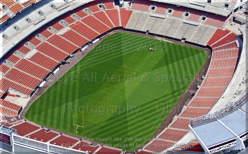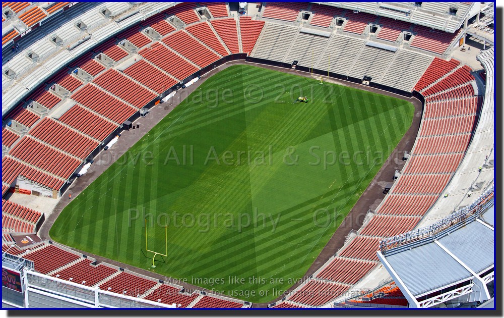 "Field Prep" The new college football season kicked off last weekend, and this week, the NFL season begins. This low and close aerial view looking into Cleveland Browns Stadium (which is now known as FirstEnergy Satidum) shows the mowing pattern cut into the field and a tractor in the early stages of marking the lines. This type of view is currently only possible from a helicopter. Although helicopters cost more to operate than airplanes, the view is often more dramatic and "sexy" than the views we see from an airplane making them well worth the premium in some situations. On a side note -- soon, we may be able to capture views such as this from remote controlled helicopters ("drones," "UAV's," "quad-copters," "hexa-copters," etc.). However, please note that commercial operation of unmanned aircraft is currently illegal at ANY altitude. When the Federal Aviation Administartion finalizes the rules and sets forth the training and operating requirments of those vehicles, we will be ready to provide that service safely, legally, and with proper insurance. However, anyone doing providing that service for hire currently is operating illegally and without insurance. If you hire someone to take photos for you via remote controlled aircraft, you are taking a huge liability risk... (Here is an article from the CBC News web site which mentions a few recent drone photography accidents.) To view a larger version of this photo, click on it or click this direct link. |