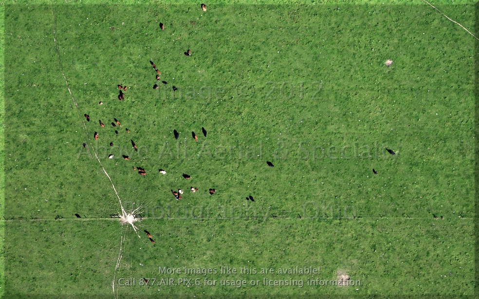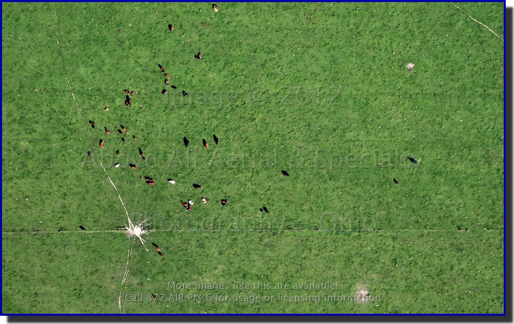 "Green, Green Field" In honor of St. Patrick's Day this week, we decided to go back to featuring a photo with a lot of green. We searched the archives and found this photo - perhaps the "greenest" photo we have! This nearly vertical aerial photo is of a field of cows feeding in a pasture. (We think it looks like a flag, especially with the paths to the feeding trough making a kind of a star pattern. What do you think?) This view makes it easy to count large animals - cows in this case - and it is similar to how we would count wildlife. However, counting deer in the woods is not this easy -- deer are very well camoflagued so our regular aerial photo maps would be of little (or no...) use for determining the size of the herd (even at very high 3-inch resolution). Fortunately, we have a better way to accomplish that task -- aerial infrared imaging. Deer generate heat, and hiding from our FLIR infrared camera is much, much more difficult! We are wrapping up this season's deer surveys (they are best done in the winter), but stay tuned if you are curious - we will feature a sample infrared animal survey image on this page in the fall. To view a larger version of this photo, click on it or click this direct link. |