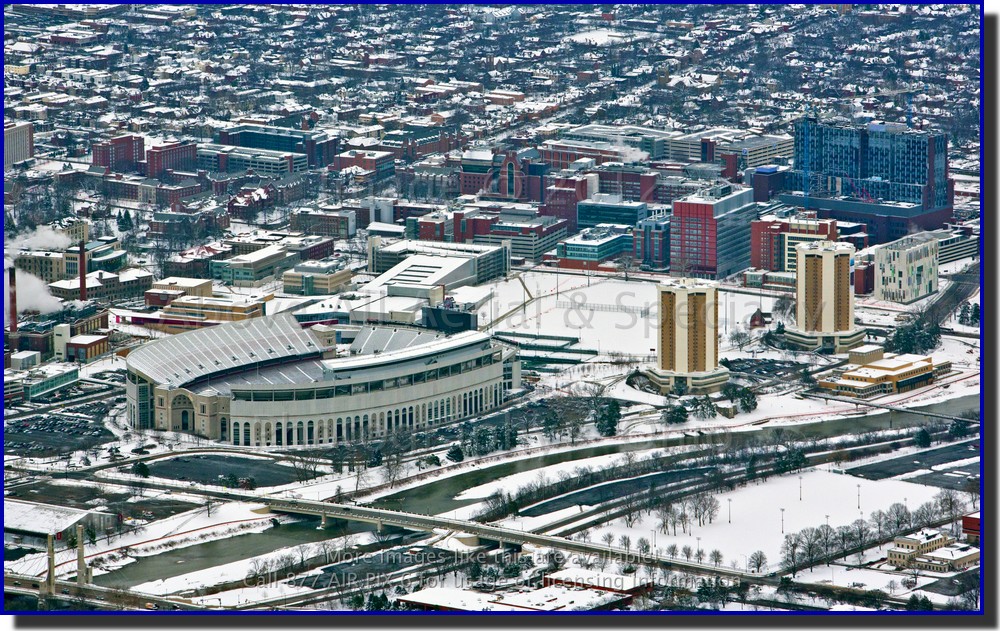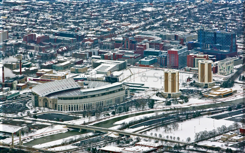 January 14-20, 2013 "Cold School" One probably doesn't need to spend a lot of time browsing our web site and our various galleries to figure out that The Ohio State University is one of our favorite places to photograph. (It is, after all, the alma mater of 100% of our full time staff...) Ohio Stadium and the twin dorm towers dominate this somewhat low-level oblique aerial winter view of the campus. Visible behind those three easily recognizable landmarks is a large part of the medical school and some of the world class hospitals that are located right on the campus. To view a larger version of this photo, click on it or click this direct link. |