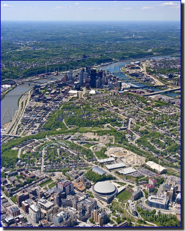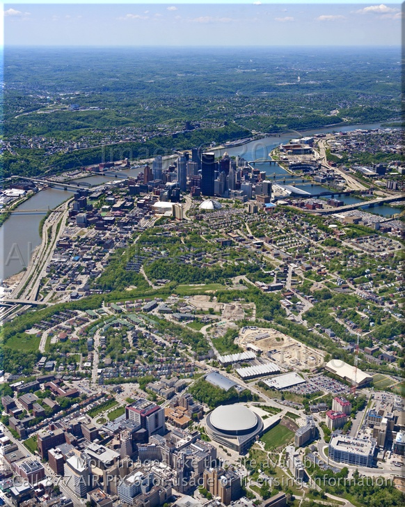 April 8-14, 2013 "Downtown Pittsburgh, Pennsylvania" Another downtown area that we visit regularly is Pittsburgh, Pennsylvania. In the foreground of this portrait-oriented aerial view of Pittsburgh is part of the University of Pittsburgh. The round building just right of center near the bottom of this photo is the Petersen Events Center. The University's men's and women's basketball teams play here, of course, but the facility also plays host to a variety of concerts, conventions, and other events. In the distance, again to the right of center, Heinz Field (home of the Steelers) and PNC Park (home of the Pirates) can be seen along the river. To view a larger version of this photo, click on it or click this direct link. |
