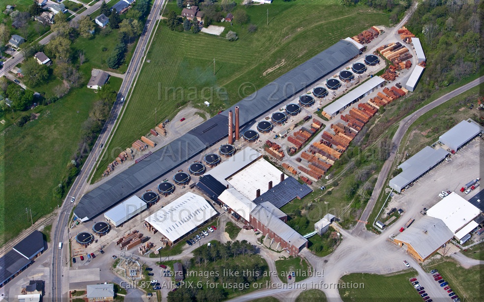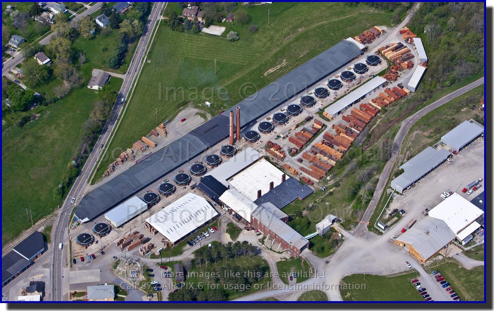 February 25 - March 3, 2013 "Brick Factory" In our attempt to help chase away the winter blues, we have chosen another photo showing lots of green grass. This photo was taken last April after a very mild winter - things are not normally this green that early in the spring here in northern Ohio. This steep oblique aerial photo is of The Belden Brick Company in Sugarcreek, Ohio (south of Canton, in Ohio's Amish Country). The original twin smoke stacks are still used and in this photo, you can see the name of original company - "Finzer Bros." built into one of them. The stacks appear to have been shortened at some point in time, however, as the top of the "F" in "Finzer" is missing. This factory was originally built and owned by a family of Swiss immigrants in the mid-1800's according to a brief history of the plant found here: Finzer Brothers Clay Company (The writer of the article incorrectly states that the name of the town is two words - "Sugar Creek" - but as far as we know, the rest of the article is accurate.) To view a larger version of this photo, click on it or click this direct link. |