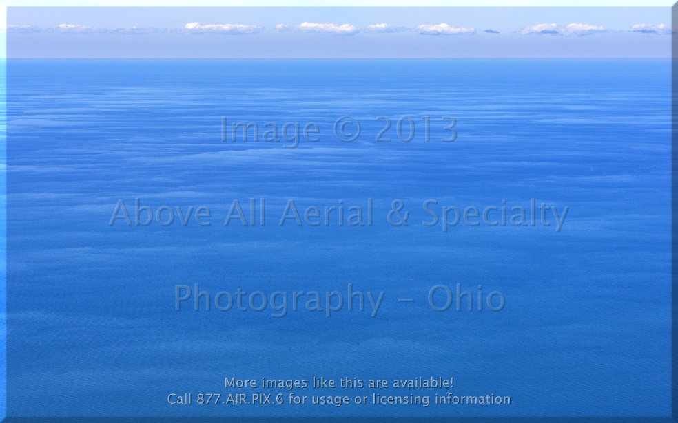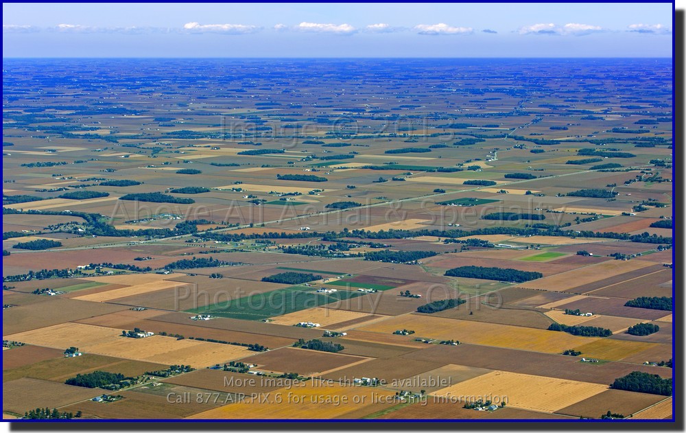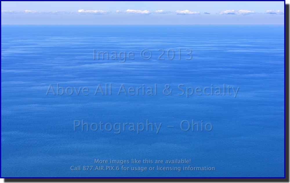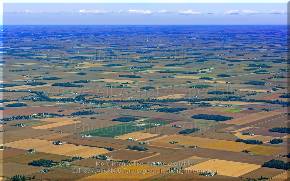 "Geographic Similarity" It occurred to us while flying over the fertile farmland of northwestern Ohio that the geography there was nearly as perfectly flat as water... A flight that took us out a little ways out over Lake Erie a few days later confirmed our observation. What do you think? Aside from the colors and a little bit of texture given to the farmland by areas of trees, the two ares are almost equally flat. (In case you noticed, yes, the sky and clouds are identical in both photos. We copied them from one photo and inserted them into the other in order to make the photos even more similar...)