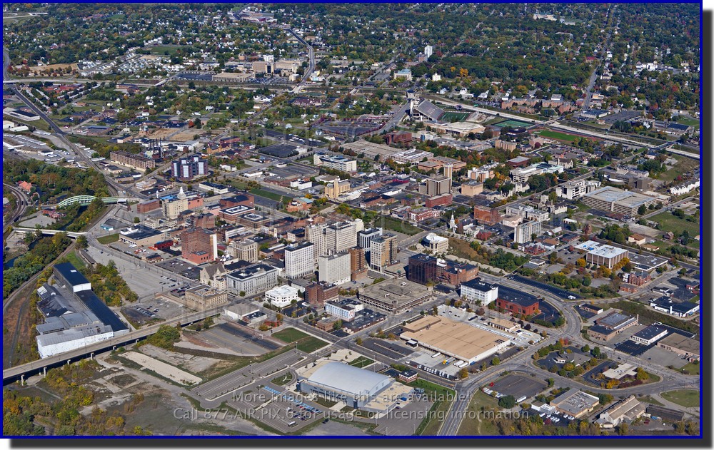 April 22-28, 2013 "Downtown Youngstown, Ohio" Youngstown, Ohio, is located in northeastern Ohio and is just a short flight from our home airport in Medina. This wide angle aerial view was captured on a beautiful fall day in October, 2007. According to the city's official web site, Youngstown was incorporated in 1867. The city is probably most known locally for its large steel industry and is currently enjoying a rebound from the recession that hit many industrial cities very hard recently. Visible in the upper part of this photo, just right of center, is the campus of Youngstown State University. The University's athletic facilities - the towering stands of the football stadium (Stambaugh Stadium), the bright green rectangle of tennis courts, and the red oval running track - are the easiest landmarks to spot in this aerial photo. To view a larger version of this photo, click on it or click this direct link. |