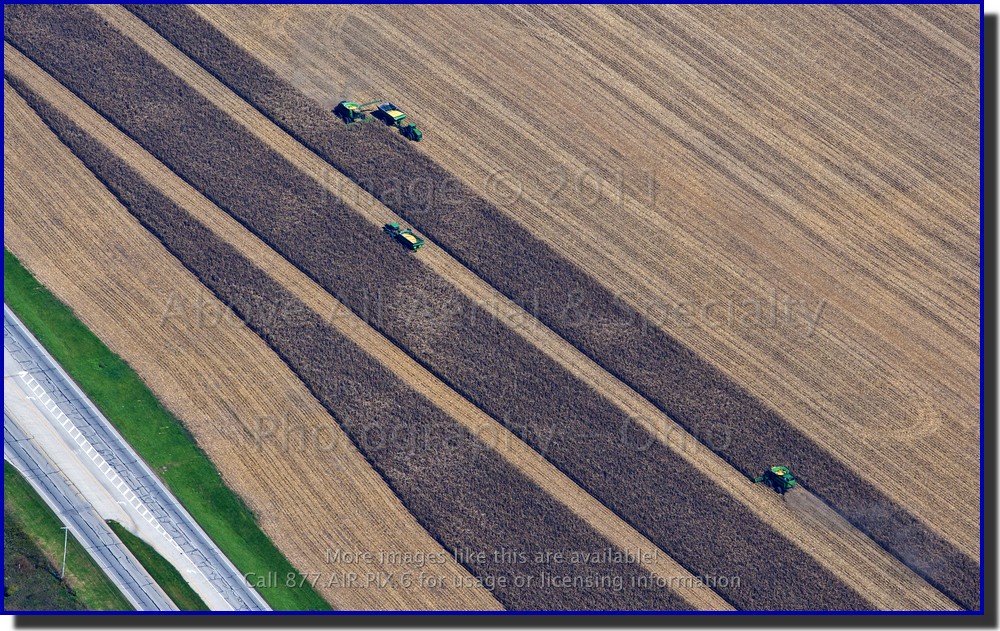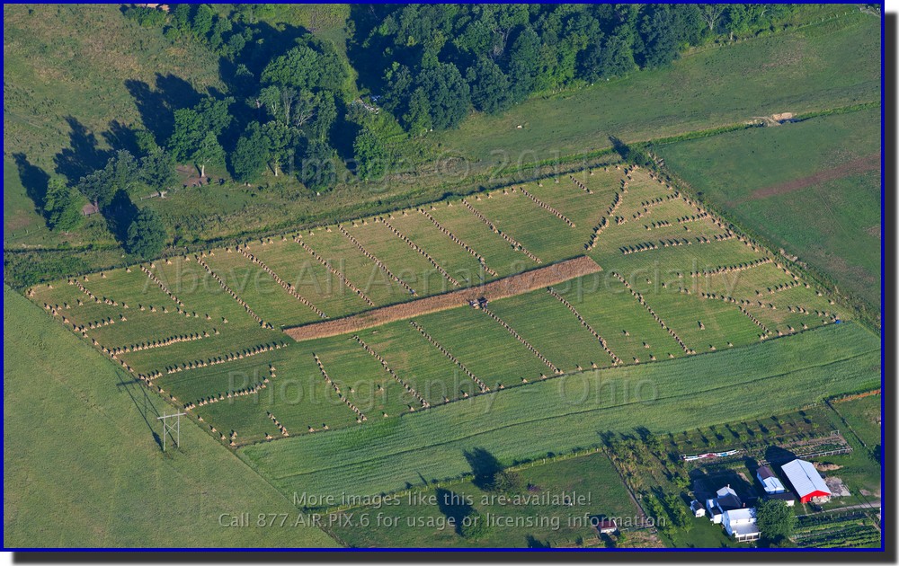 We always enjoy watching the harvest from the air - combines, trucks, tractors, and wagons move up and down the fields making really neat geometric patterns on the ground. However, here in Ohio, we also have a large Amish population and their "old fashioned" ways of harvesting make for particularly interesting views of the landscape. We are fortunate that our work takes us over these rural areas of Ohio and we never tire of the view. One such view was featured as our "Stock Photo of the Week" on August 9, 2010. Here are a couple more views (Tip! Hover your mouse pointer over the photo for a brief description): |