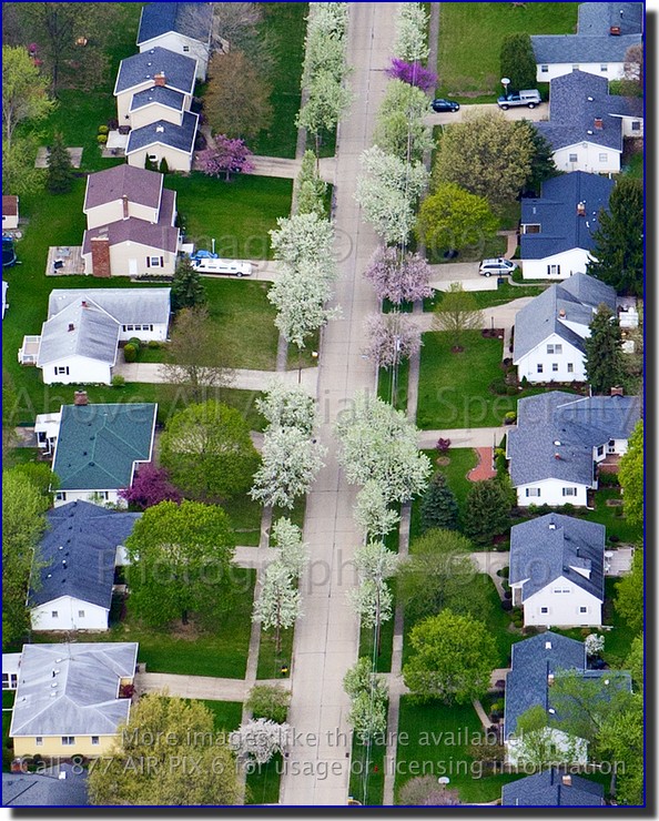 The record-breaking high temperatures we've had here in northern Ohio (along with many other parts of the country) has the trees, flowers, and grass confused... Normally during this time of the year, we are filling our April schedule with jobs for clients that have land or buildings which we be obscured by the leaves of full trees until November. However, this year, the flowering trees are already in full bloom, and we are scrambling to get photos before the trees leaf out. Right now, the view from the air is still full of brown trees and fields in rural areas, but the grass is green in suburban areas. Soon, the buds on the trees will begin to open and we will start seeing a sort of green tint to the trees. The flowering trees shown below on April 29, 2009, look just like this right now at the end of March, 2012 (though the leaves on the non-flowering trees are not as full... yet...). The point here is that the window of opportunity to get photos while the trees show a little green but don't obscure the ground of buildings below is very small - if you would like photos in these conditions, please contact us right away to schedule your flight! Of course, if you miss the window this year, there's always next year....... |